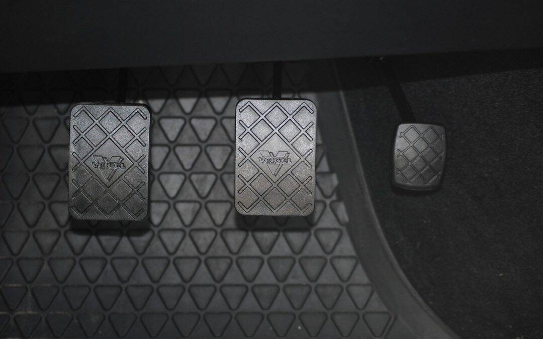- Gira el tobillo hacia la derecha (el borde izquierdo del pie presiona el pedal — primer golpe).
